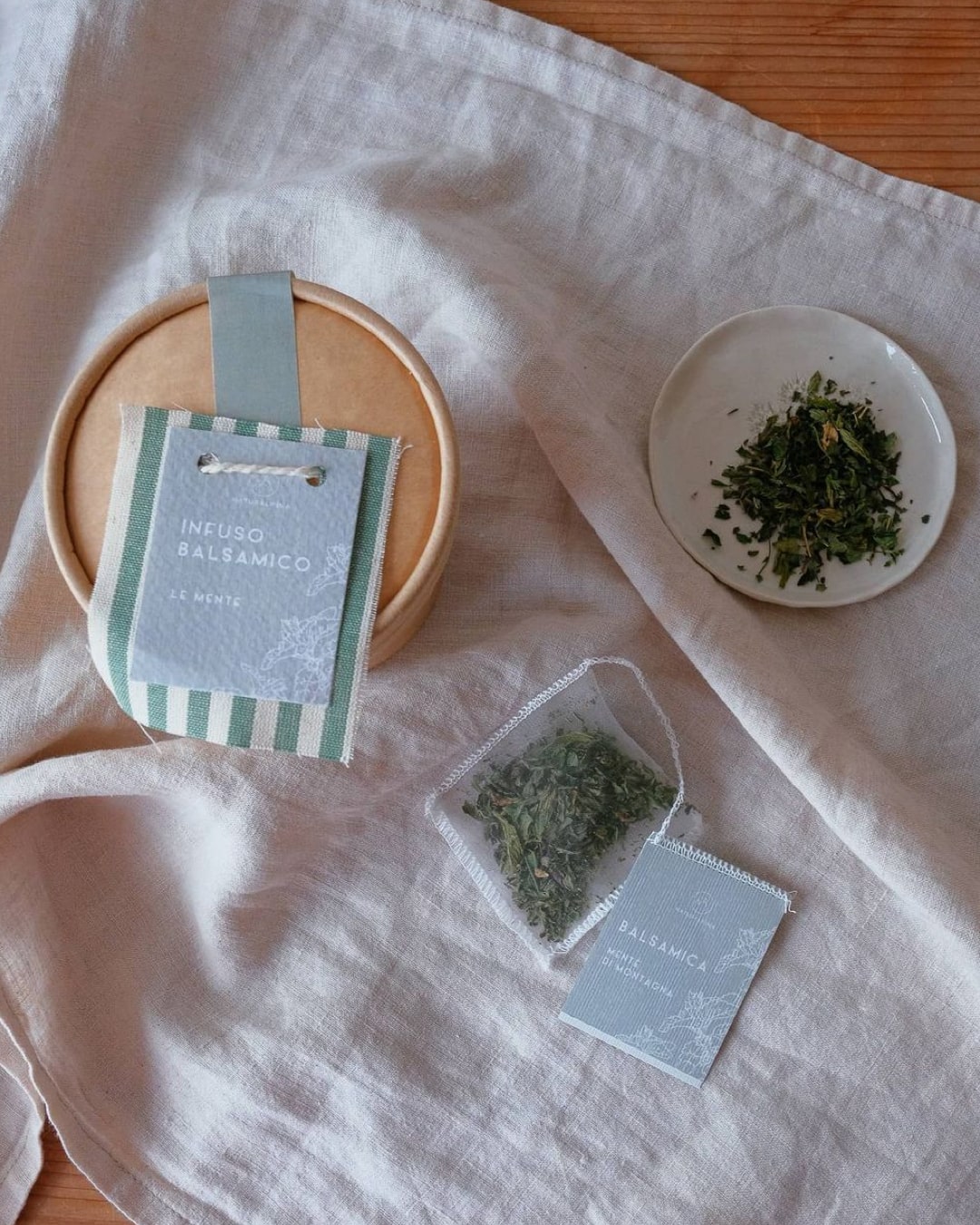 – 1 vaso di infusi con foglie e fiori dal nostro giardino aromatico in filtri confezionati e cuciti a mano (8 filtri da teiera)