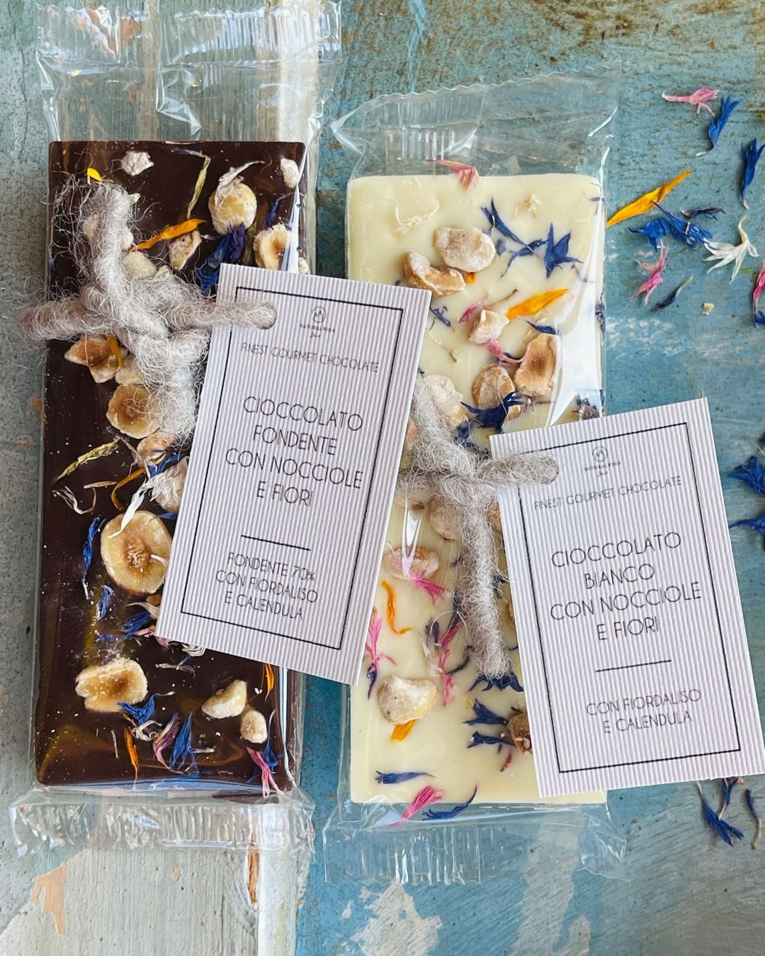 – 1 Cioccolato artigianale con nocciole, fiordaliso e calendula, a scelta tra Fondente 72% o Bianco