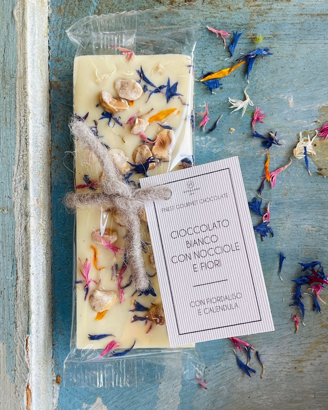 Tavoletta di cioccolato bianco con nocciole croccanti, impreziosita dai nostri fiori eduli di fiordaliso e calendula, coltivati e raccolti nei giardini aromatici di Naturalpina.